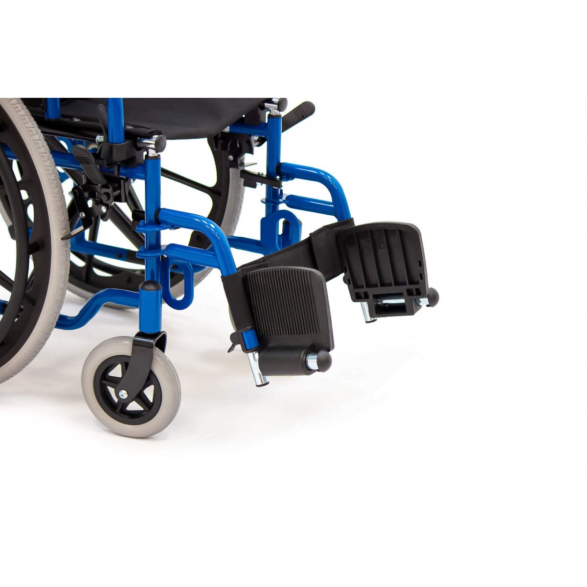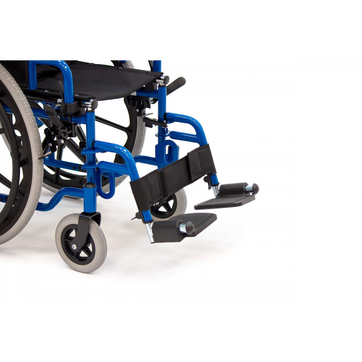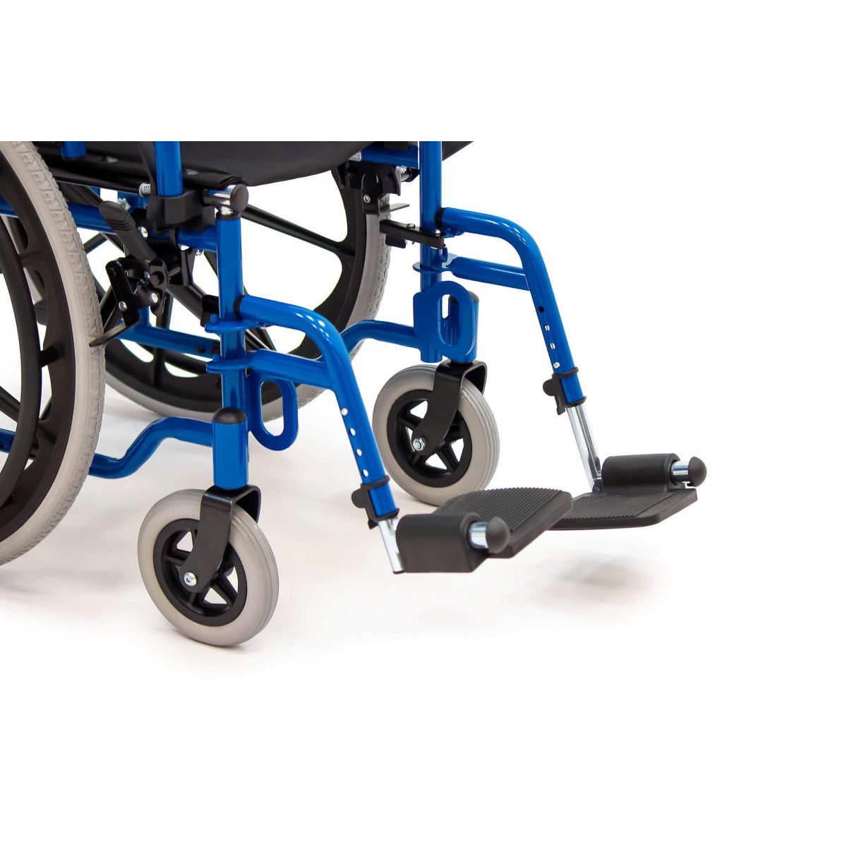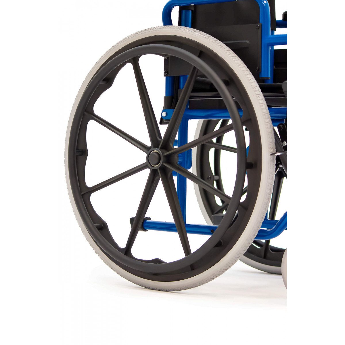 Сиденье и спинка выполнены из прочного нейлона, который устойчив к износу и прост в уходе. Литые колёса не требуют обслуживания и обеспечивают надёжность в ежедневном использовании. Для безопасной остановки предусмотрены боковые стояночные тормоза.