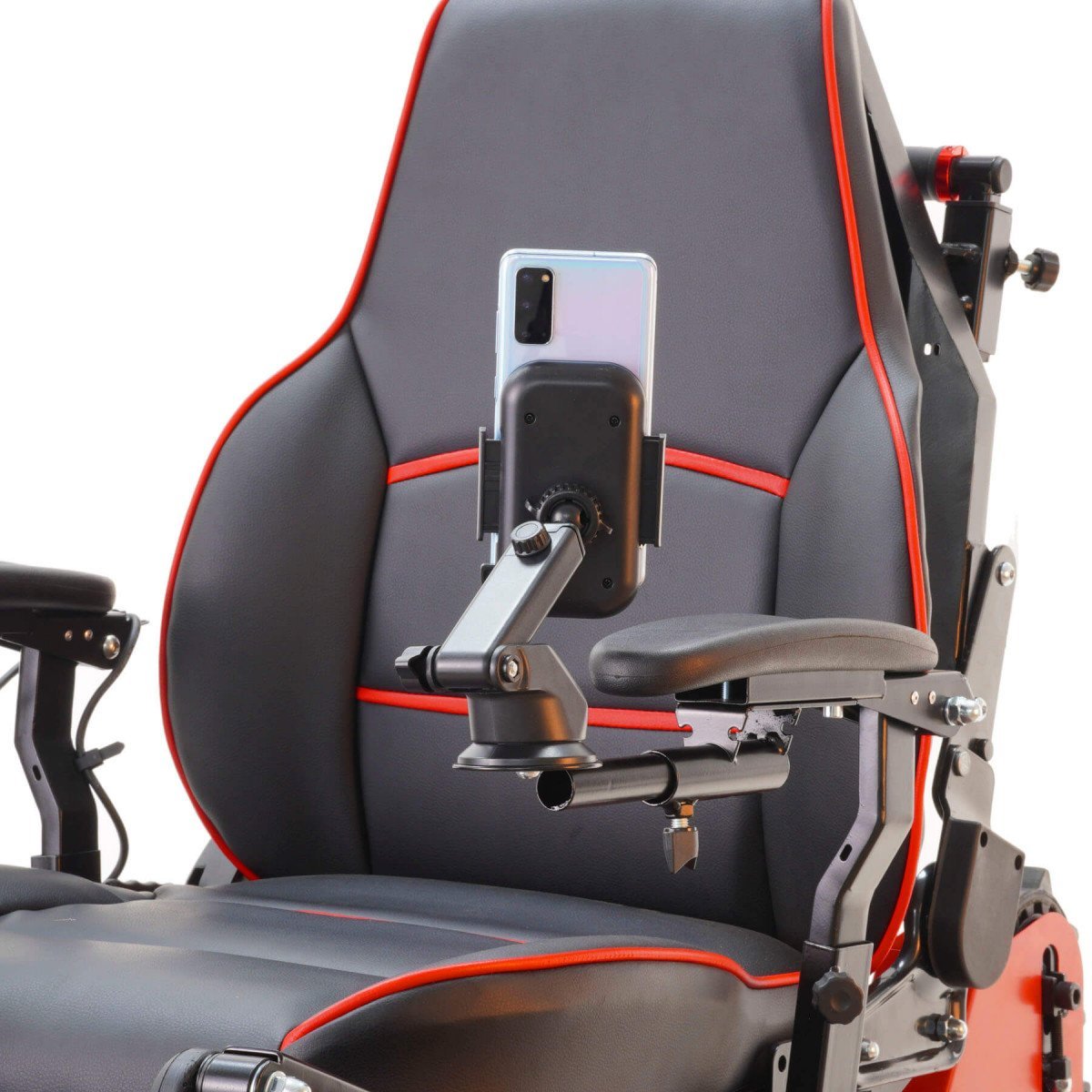 Пять регулировок (длина вылета от подлокотника, поворот, наклон, длина вылета крепления, шаровая регулировка держателя) позволяют настроить положение максимально гибко. Минимальная ширина телефона 55 мм, максимальная – 105 мм