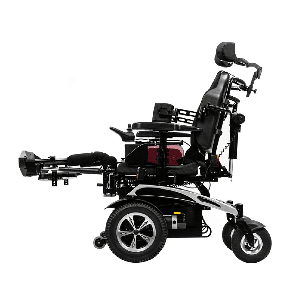Коляска отличается продуманной системой комфорта: угол наклона спинки, подножек и сиденья регулируется с помощью электропривода, позволяя пользователю подобрать удобное положение для отдыха или активного движения. Эргономичная форма сиденья поддерживает правильную осанку и снижает нагрузку при длительном использовании.