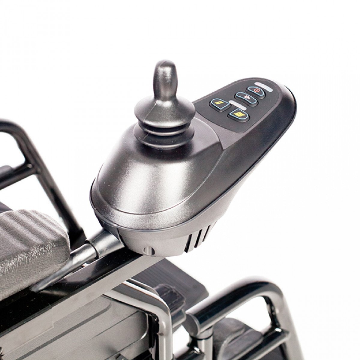 Коляска проста в использовании: пульт управления можно установить с удобной стороны и настроить по вылету, а при отключении электропривода модель легко переводится в режим сопровождения. Подлокотники и подножки — съёмно-откидные, что упрощает пересаживание и настройку под пользователя. Спинка складная, а сиденье выполнено из прочного материала, который не растягивается и легко очищается.
