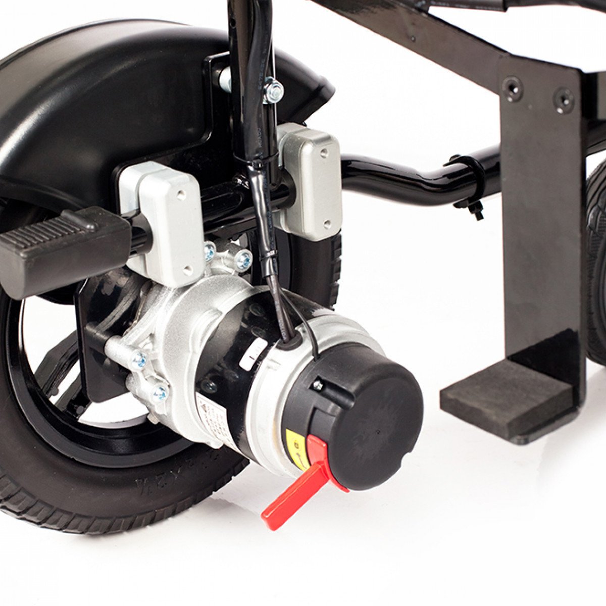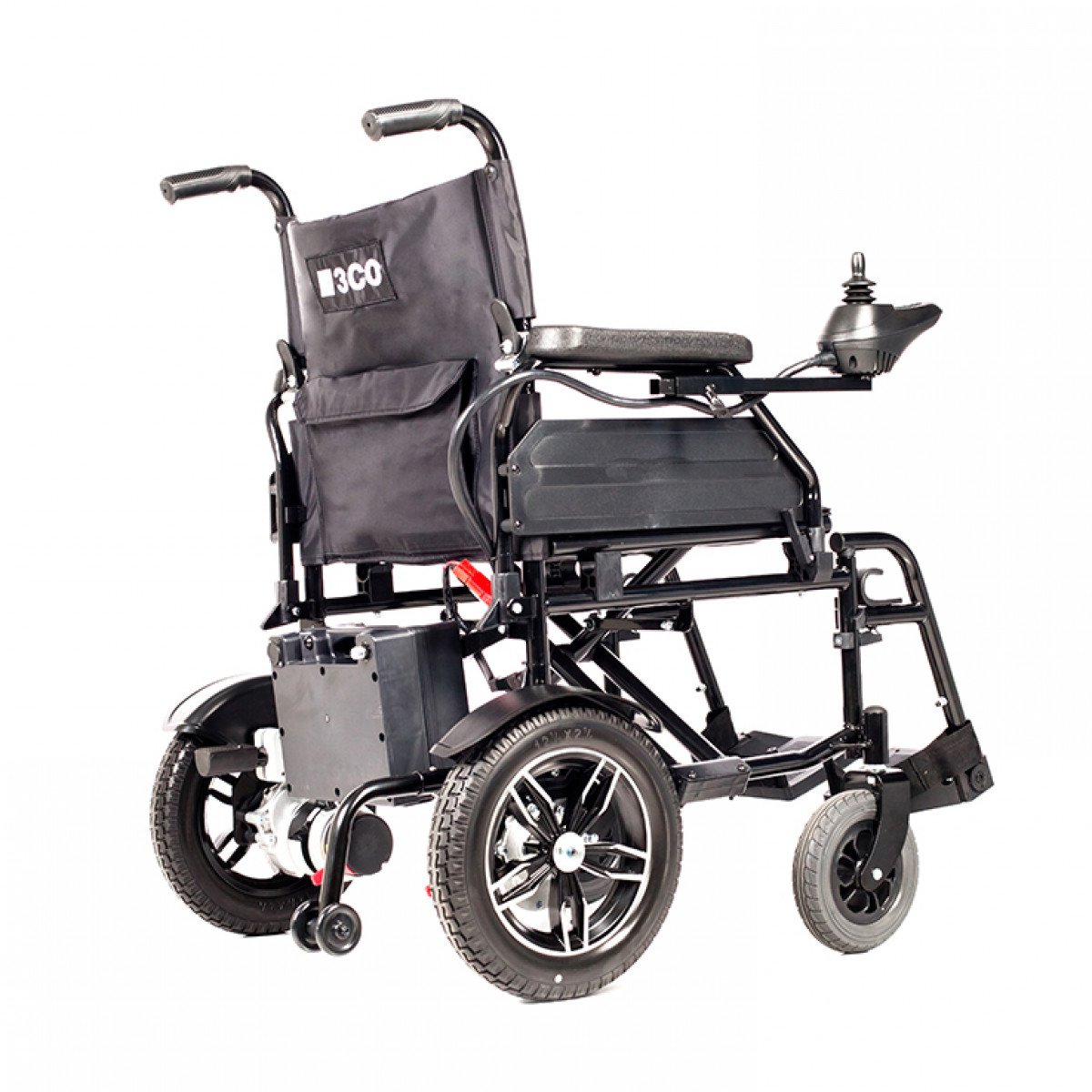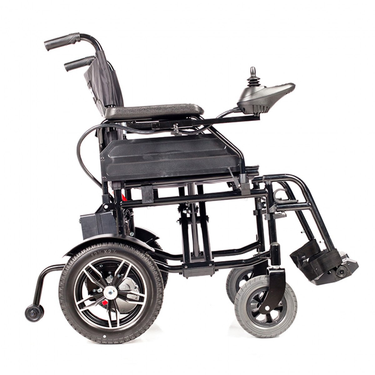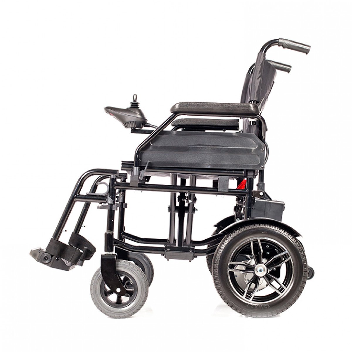 Рама изготовлена из стали с антикоррозийным покрытием, что обеспечивает надёжность конструкции. Коляска оснащена цельнолитыми колёсами, не требующими обслуживания. Два аккумулятора размещены под сиденьем и не требуют сложного ухода. Для безопасности предусмотрены ремень фиксации, стояночный тормоз и антиопрокидыватели с регулировкой по высоте. Складной механизм позволяет компактно хранить и перевозить коляску.