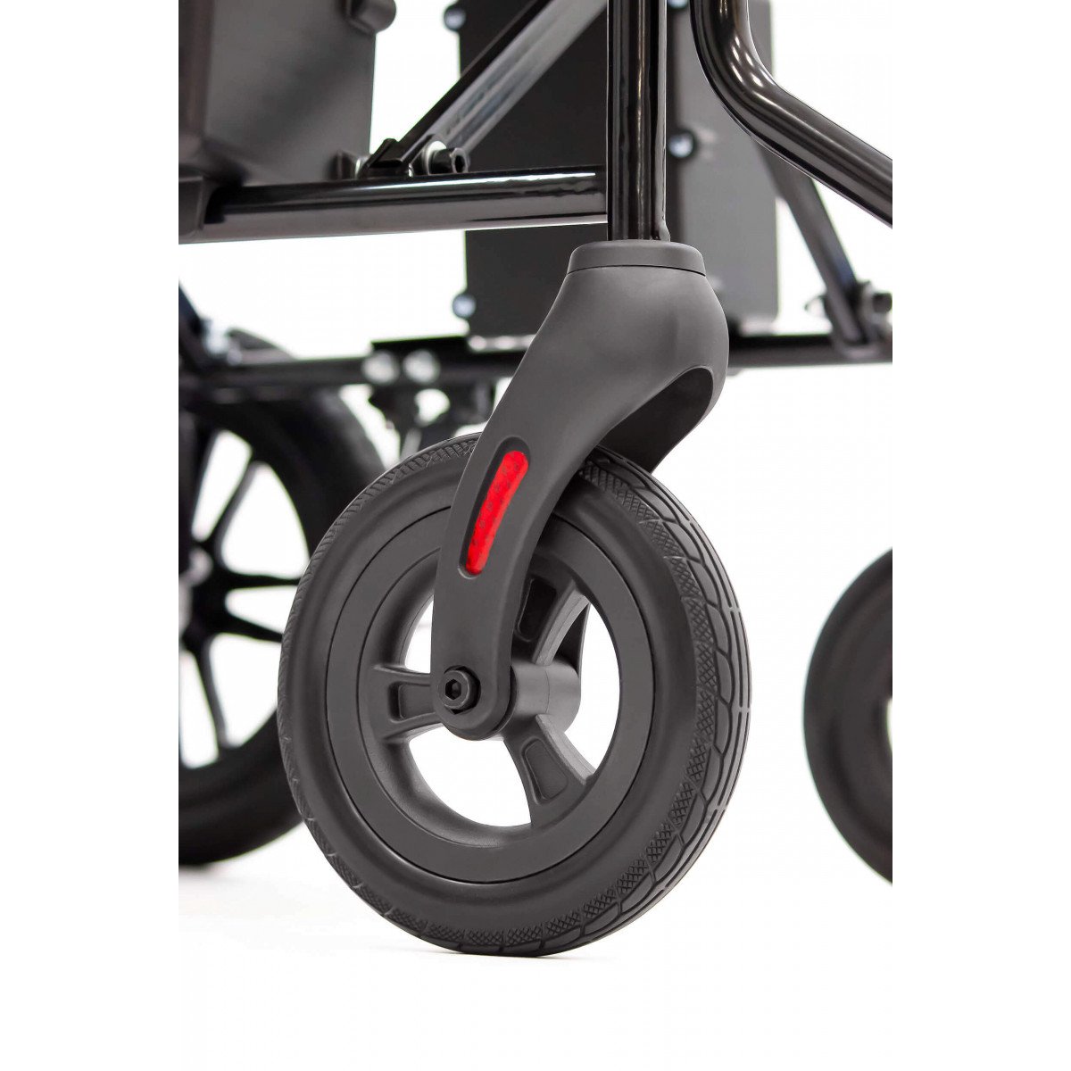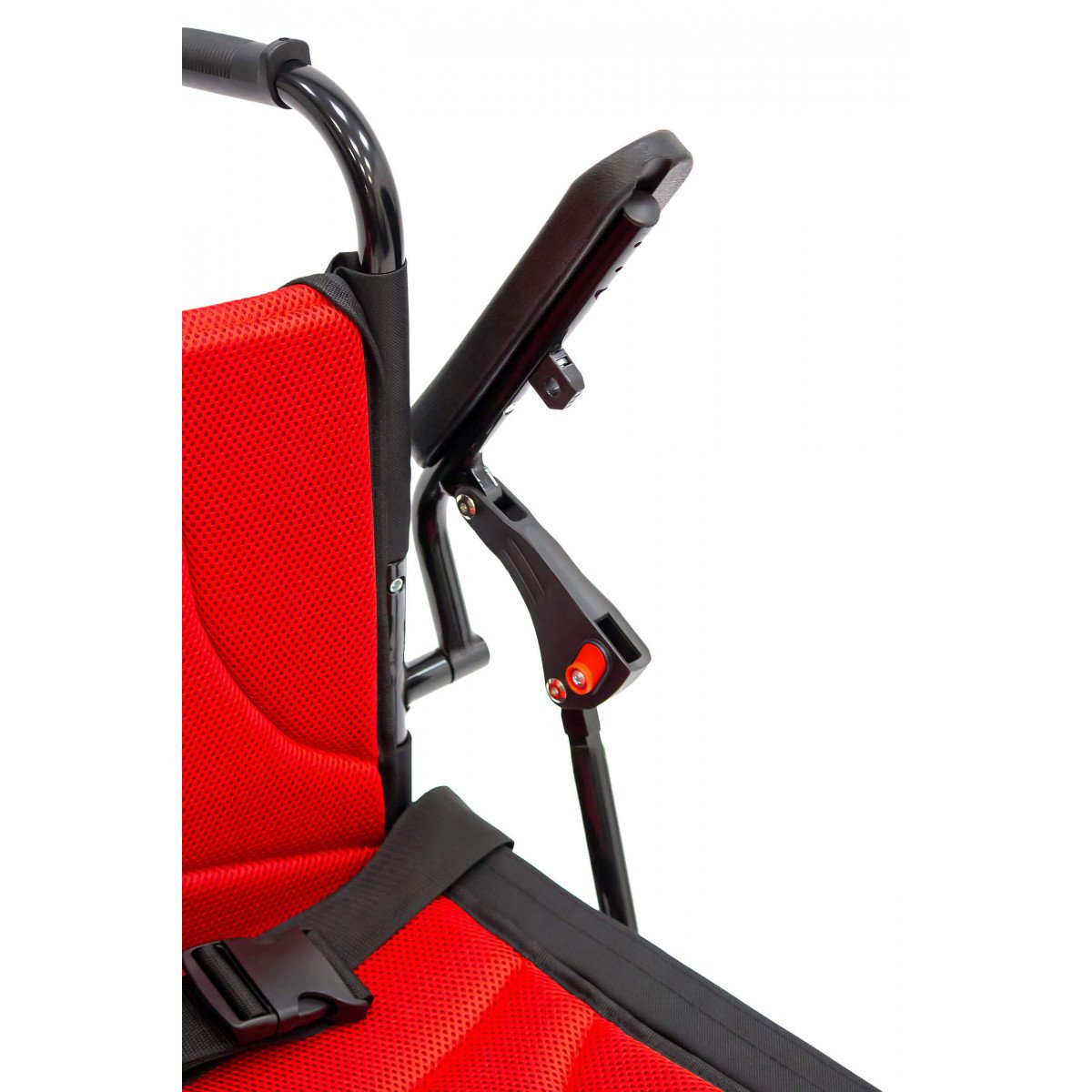 Для устойчивости предусмотрены антиопрокидыватели — они помогают сохранить баланс и повышают безопасность при движении. Контроллер можно установить с правой или левой стороны подлокотника, поэтому пользоваться коляской комфортно независимо от ведущей руки. На панели размещены джойстик, кнопка звукового сигнала, включение питания и регулировка скорости — всё под рукой и без лишних элементов.