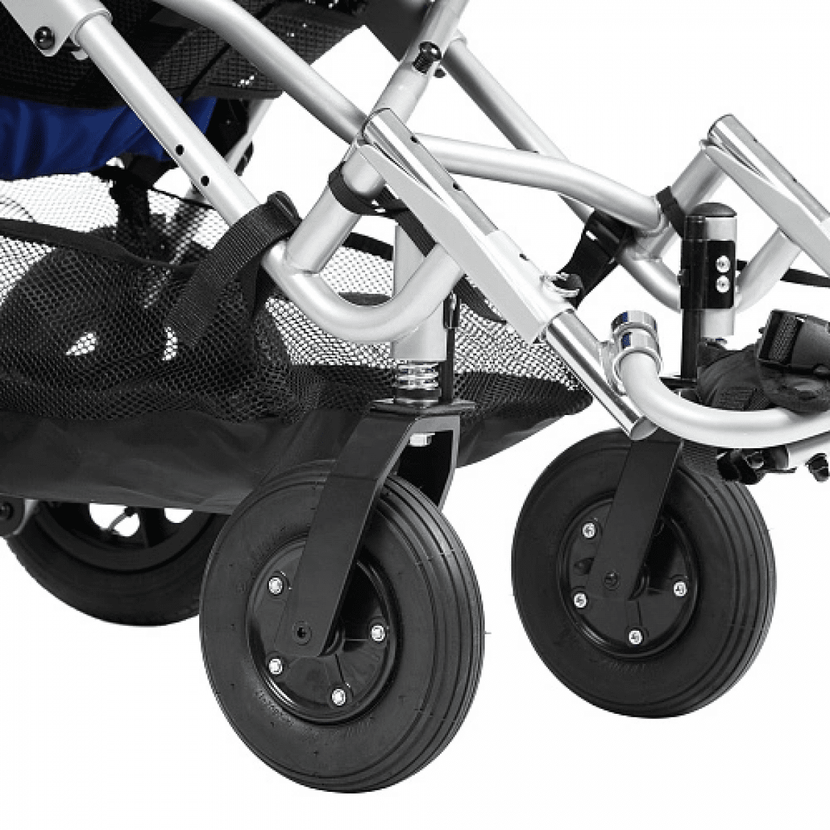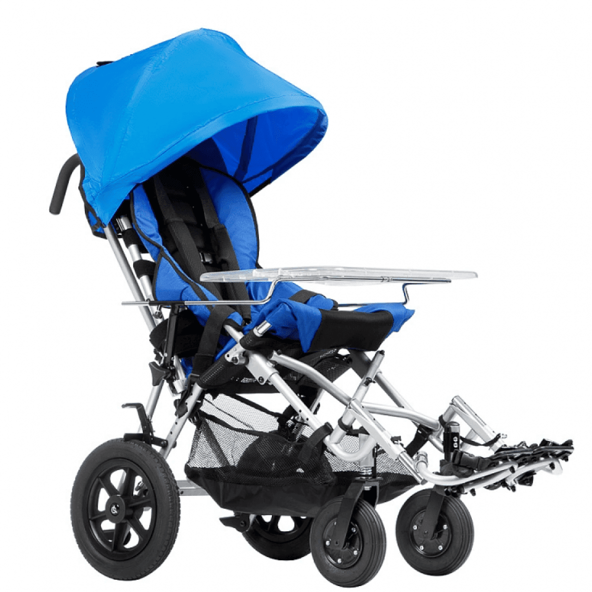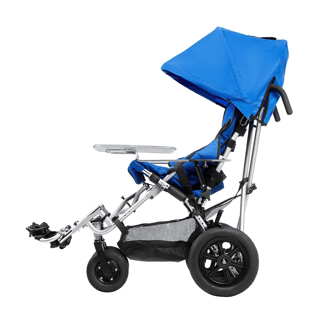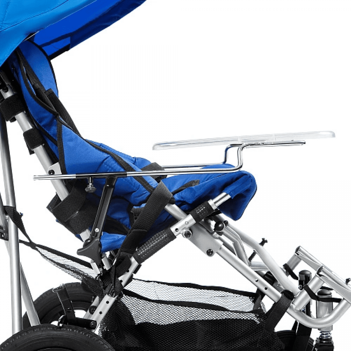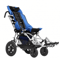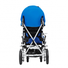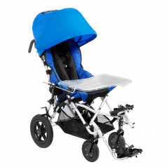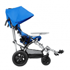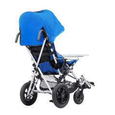 Кресло-коляска оснащено амортизаторами на передних колесах. Данная система принимает на себя ударные нагрузки, тем самым уменьшая влияние вибраций на позвоночник ребенка. Кроме того, в комплекте с коляской имеется съемный столик. Он незаменим во время приема пищи, а также дополнительно поддерживает верхнюю часть туловища.