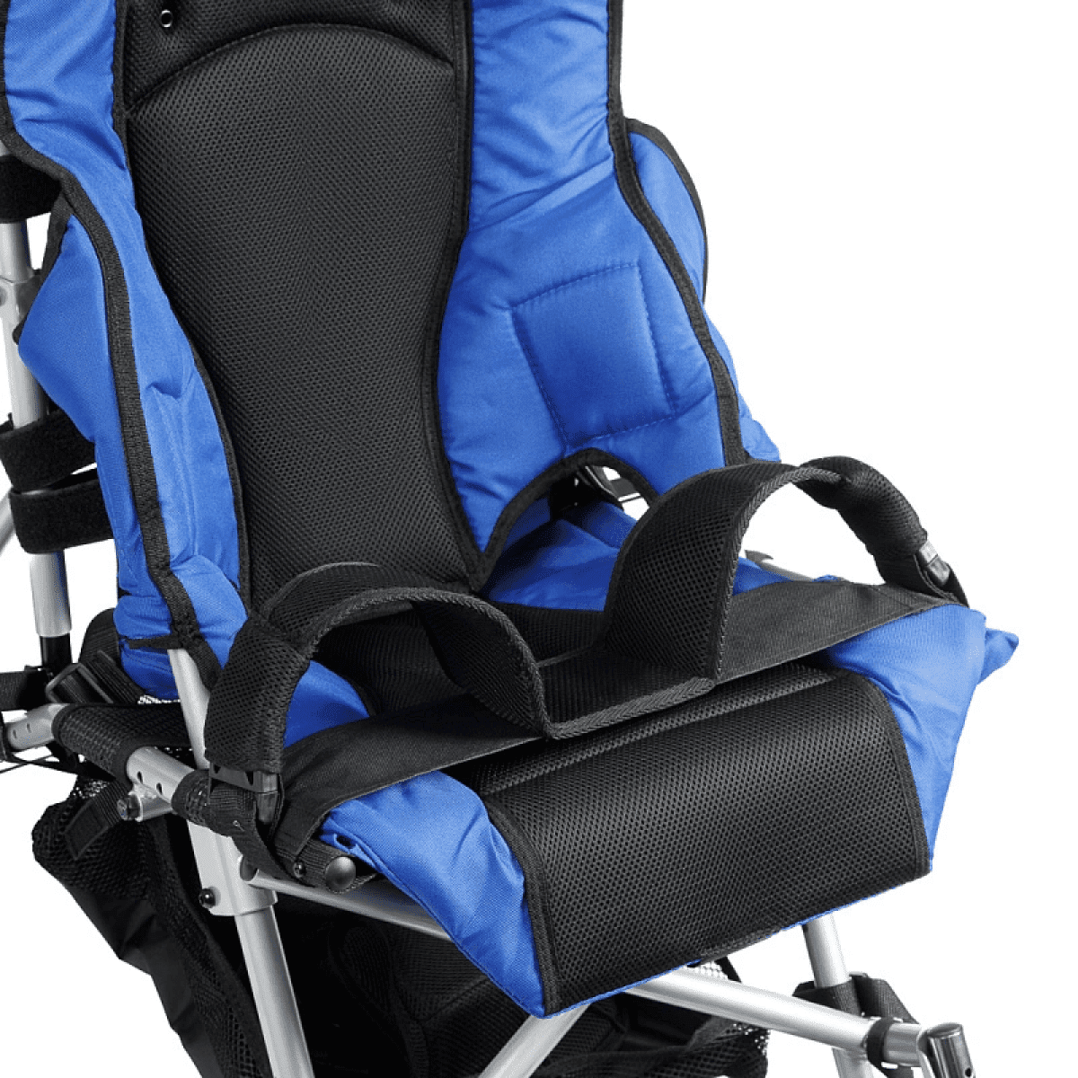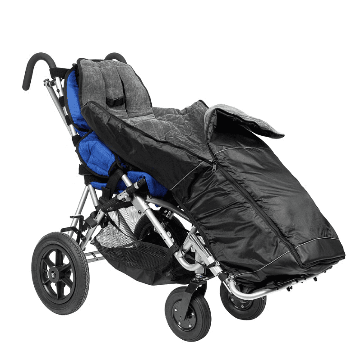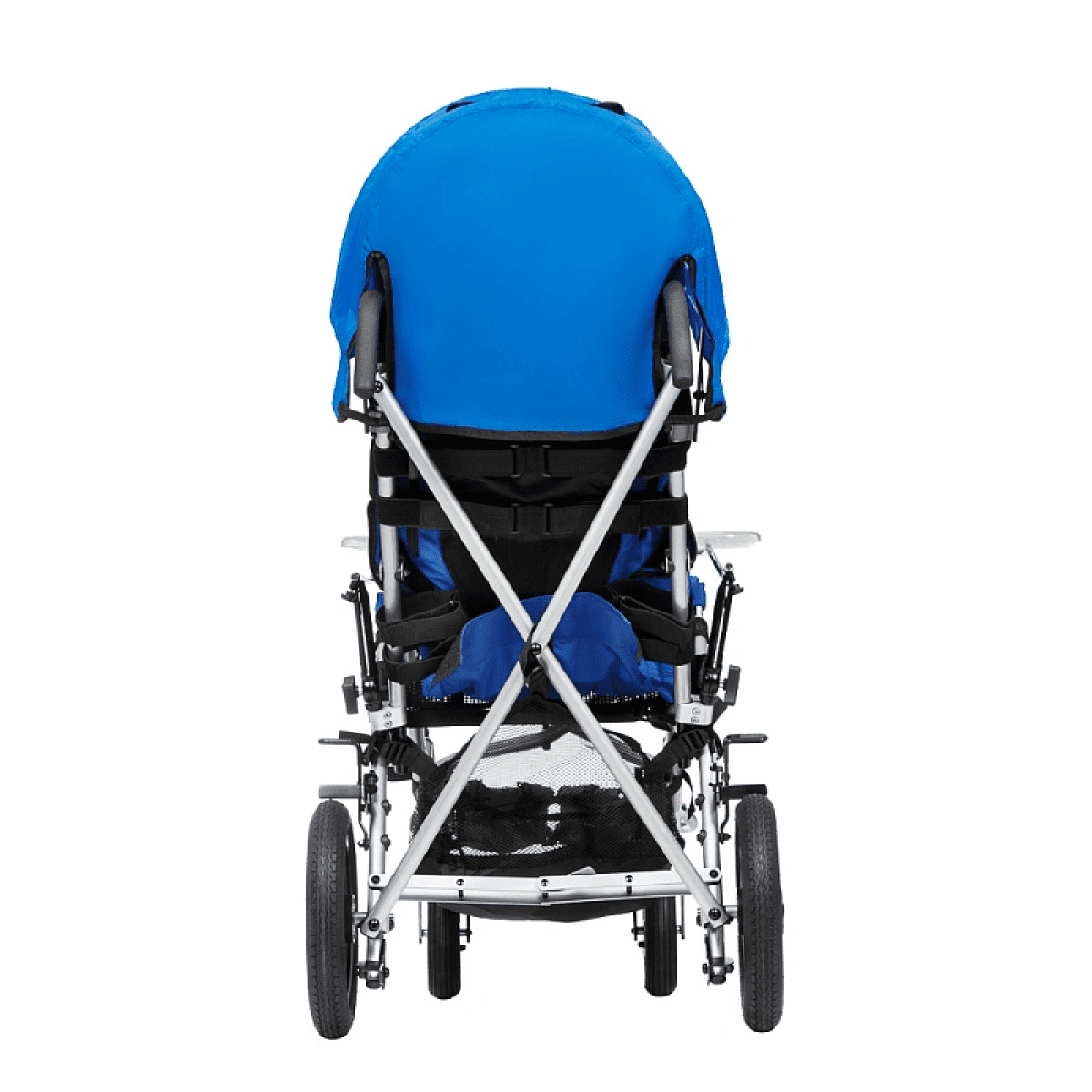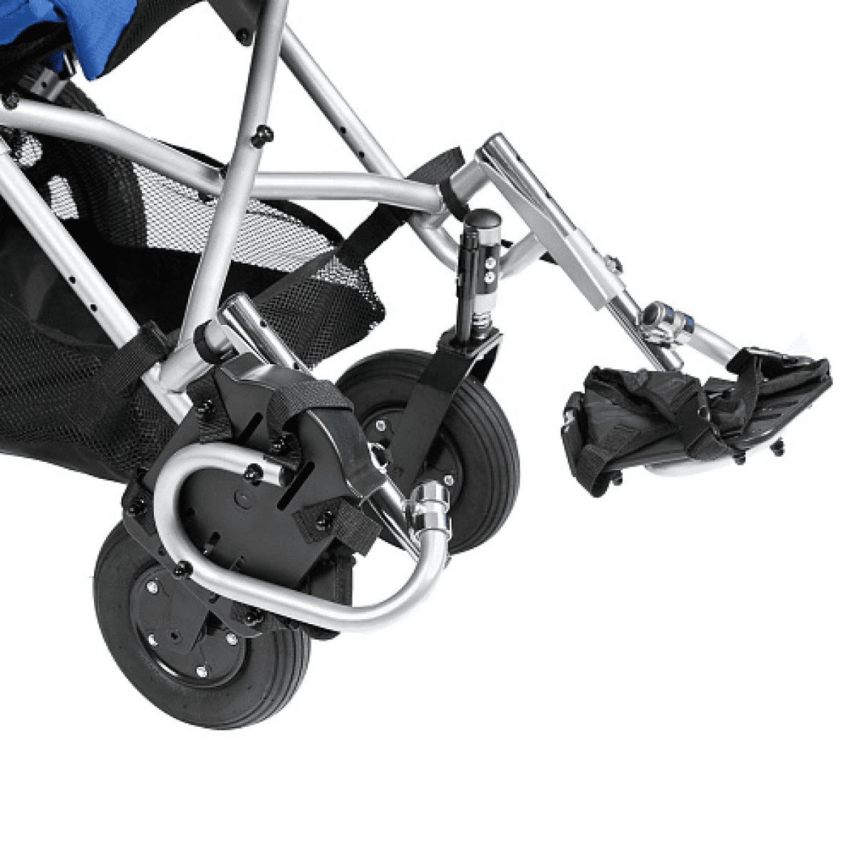 Кресло-коляска оснащено амортизаторами на передних колесах. Данная система принимает на себя ударные нагрузки, тем самым уменьшая влияние вибраций на позвоночник ребенка. Кроме того, в комплекте с коляской имеется съемный столик. Он незаменим во время приема пищи, а также дополнительно поддерживает верхнюю часть туловища.
