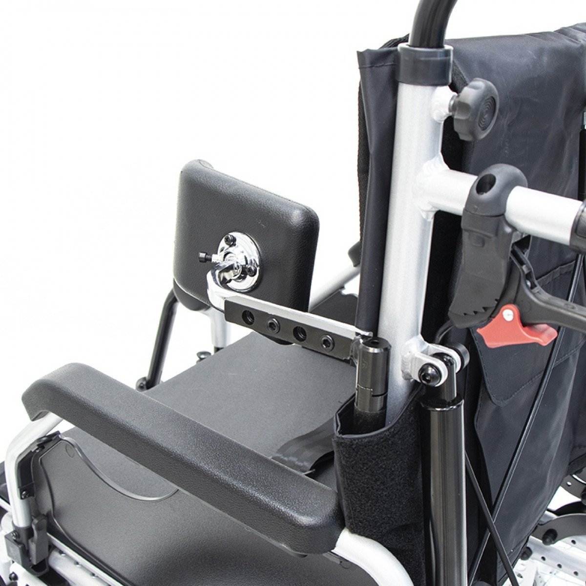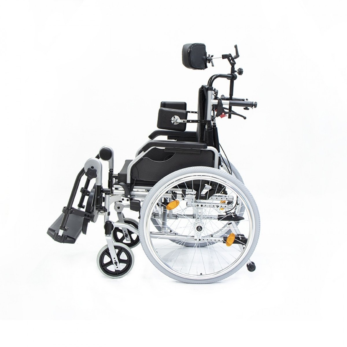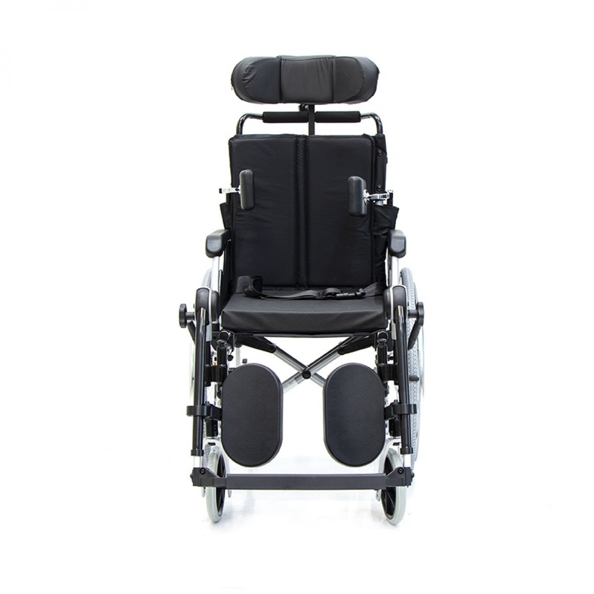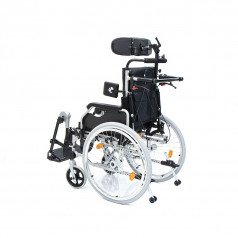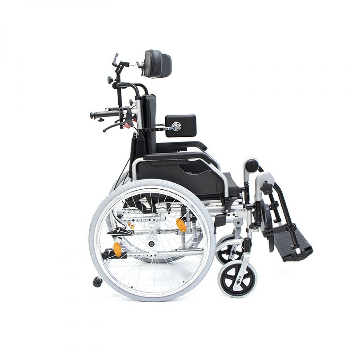 Коляска позволяет точно адаптировать положение пользователя: спинка регулируется по высоте и углу наклона и оснащена боковыми фиксаторами для поддержки корпуса. Сиденье настраивается по высоте, глубине и наклону, что помогает снизить нагрузку и подобрать удобную посадку. Подлокотники регулируются, при необходимости снимаются или откидываются, упрощая пересаживание.
