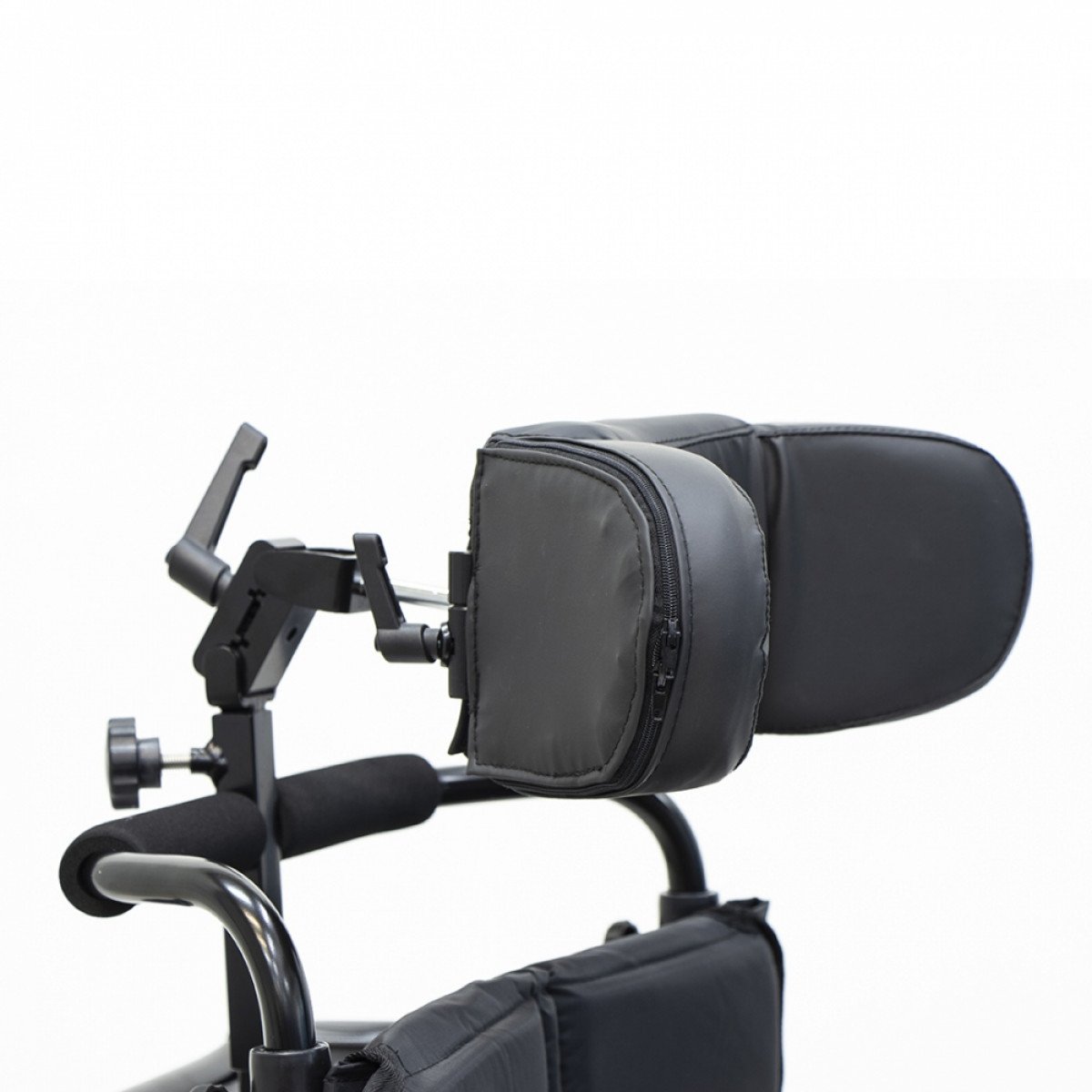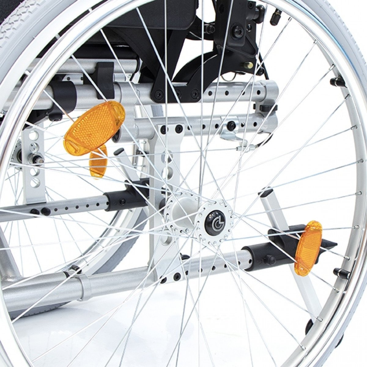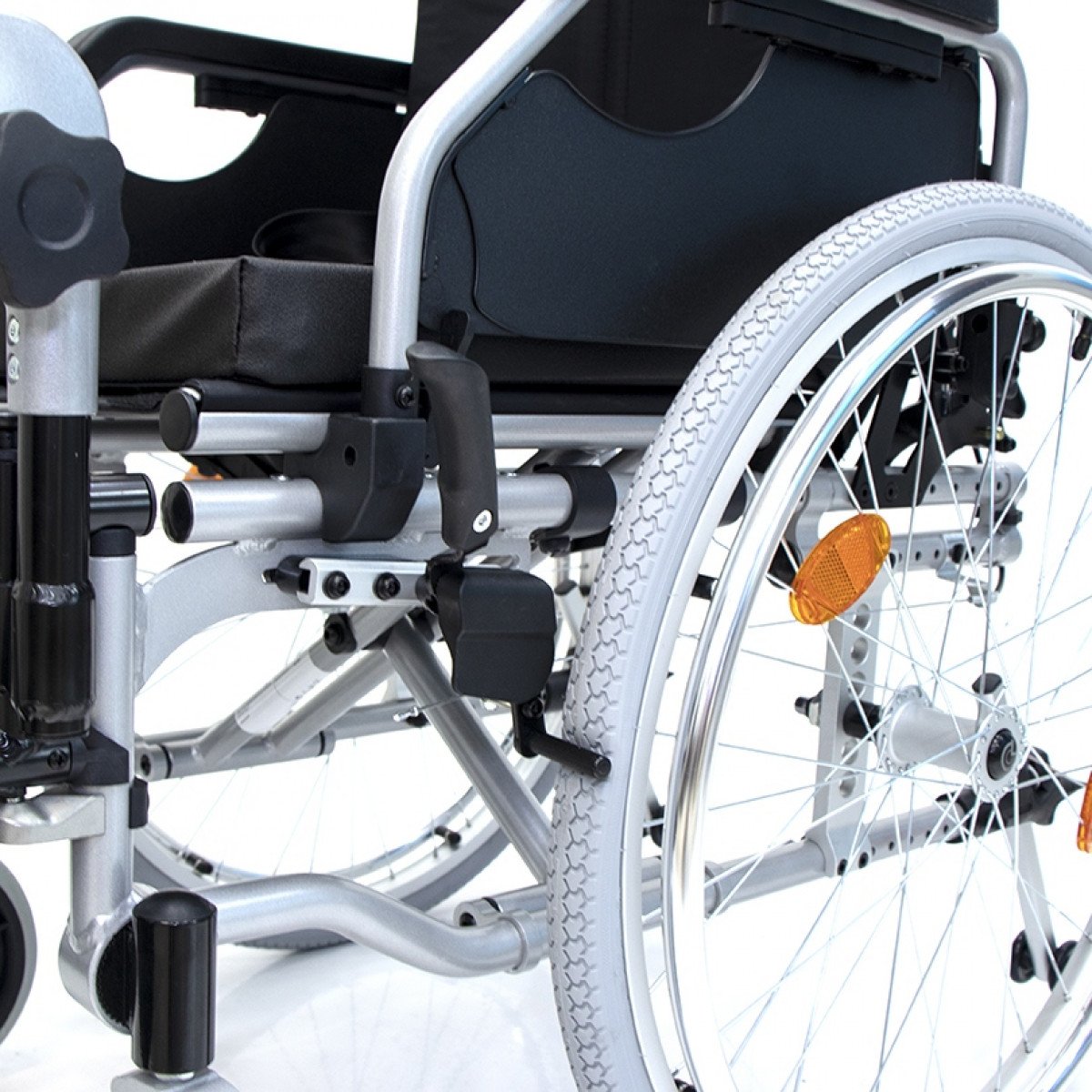 Подножки регулируются по высоте и углу наклона, оснащены ложементами и упорами для коленей для дополнительной фиксации. Опоры для стоп раздельные, при необходимости их можно объединить в единую платформу. Колёса доступны в вариантах: цельнолитые или пневматические, а для устойчивости предусмотрен антиопрокидыватель с регулировкой по высоте. Прочная алюминиевая рама с антикоррозийным покрытием обеспечивает надёжность и долгий срок службы.