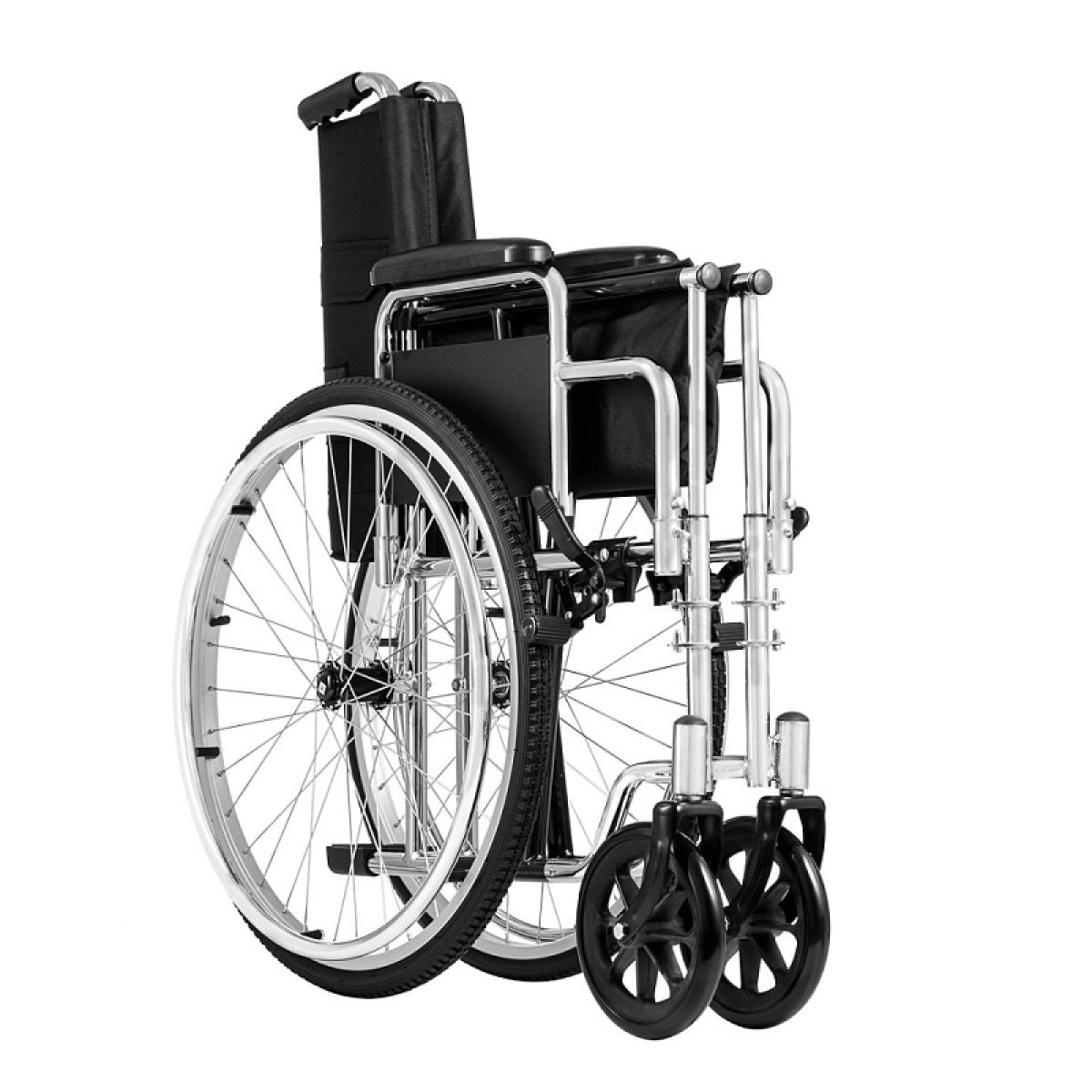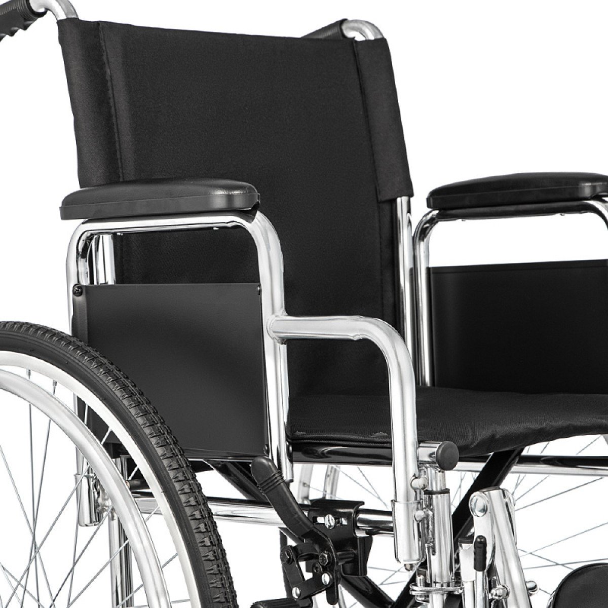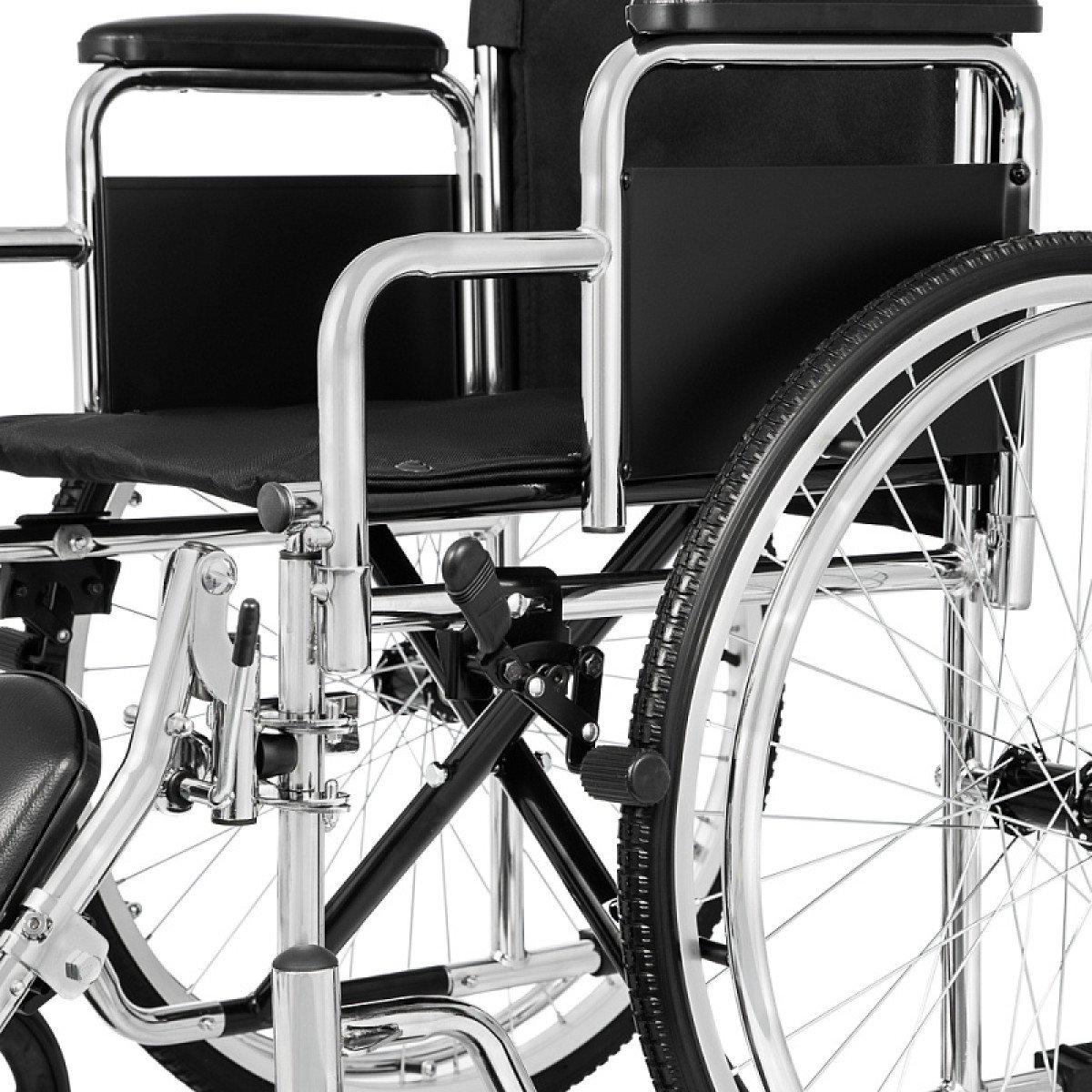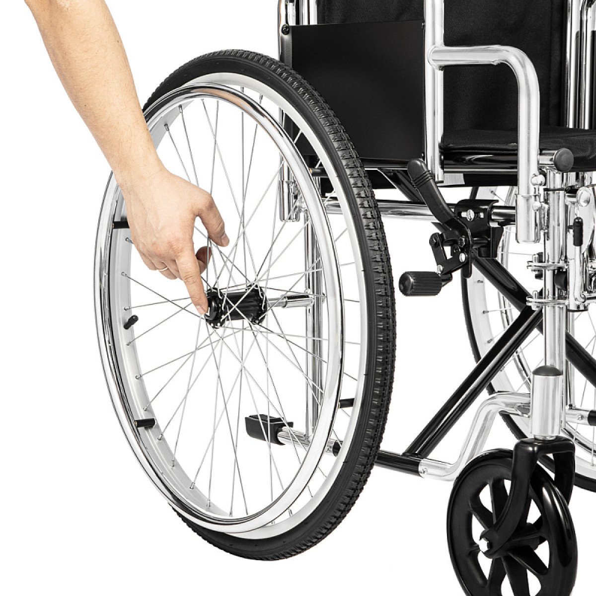 Хромированное покрытие защищает раму от коррозии и продлевает срок службы. Коляска быстро складывается без инструментов, а быстросъёмные задние колёса делают её удобной для перевозки и хранения. Для сопровождающего предусмотрены ручки, которые упрощают управление.