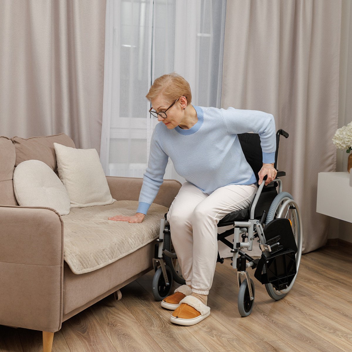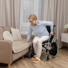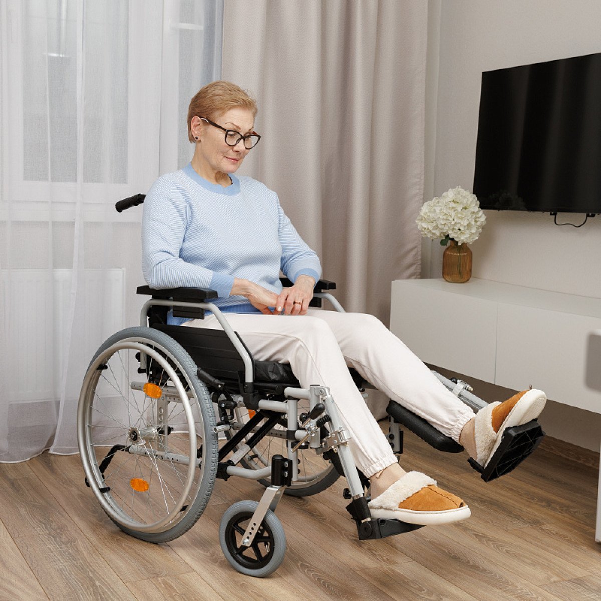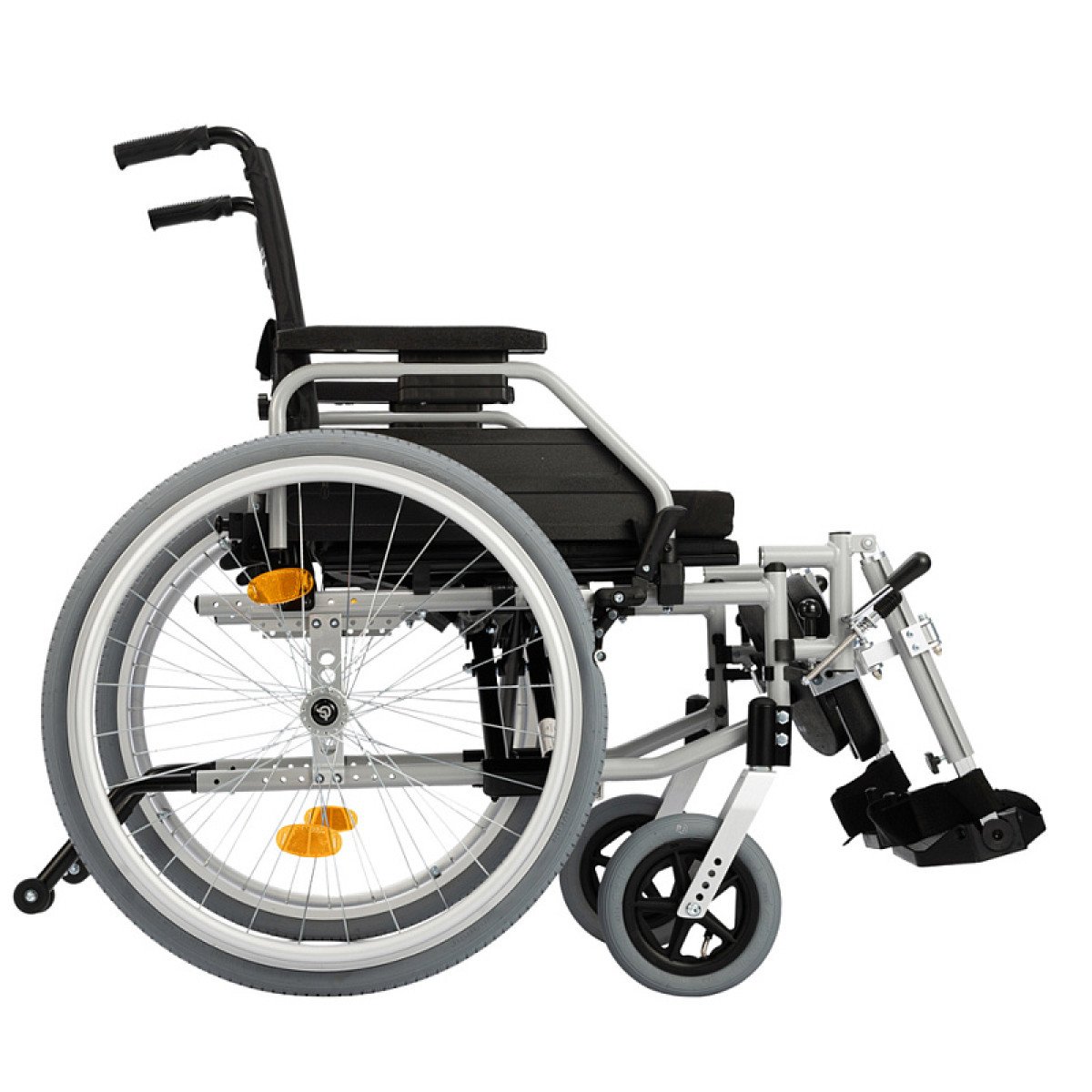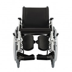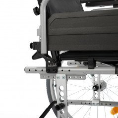 Подножки настраиваются по длине и углу наклона, дополнены мягкими опорами для голени — это важно при восстановлении после травм нижних конечностей. Подлокотники регулируются по высоте, откидываются или снимаются, облегчая пересаживание.