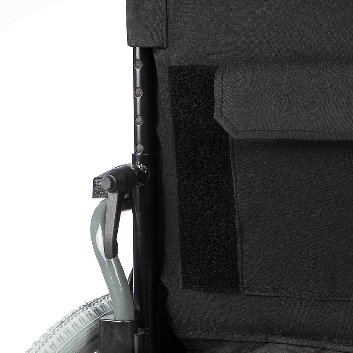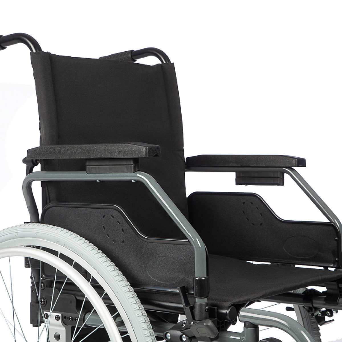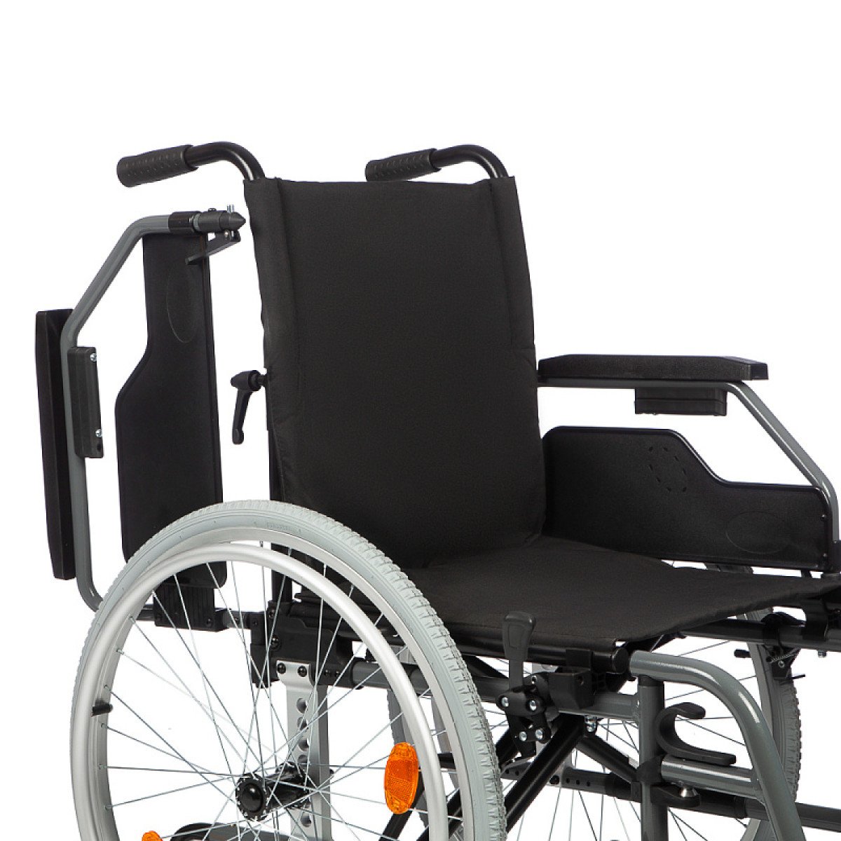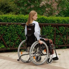 Съёмные и откидные подлокотники, а также откидные подножки облегчают пересаживание. Быстросъёмные задние колёса помогают компактно сложить коляску для перевозки.