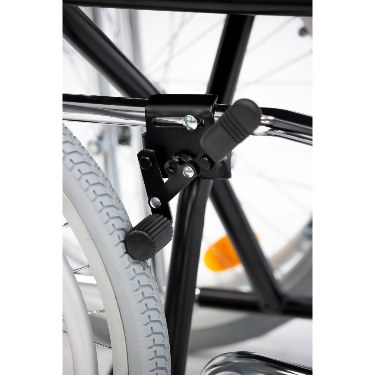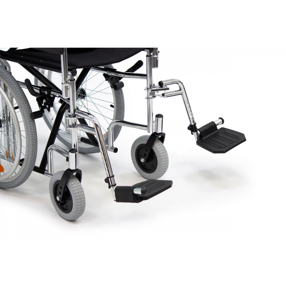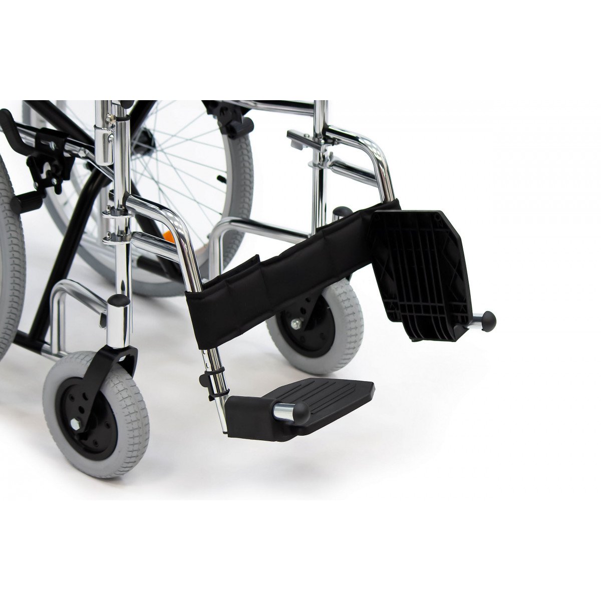 Модель подходит как для самостоятельного использования, так и для передвижения с сопровождающим. Скошенные подлокотники позволяют подъехать вплотную к столу и занять удобное положение. Коляска складывается вместе со спинкой, поэтому её удобно хранить дома и перевозить в автомобиле.