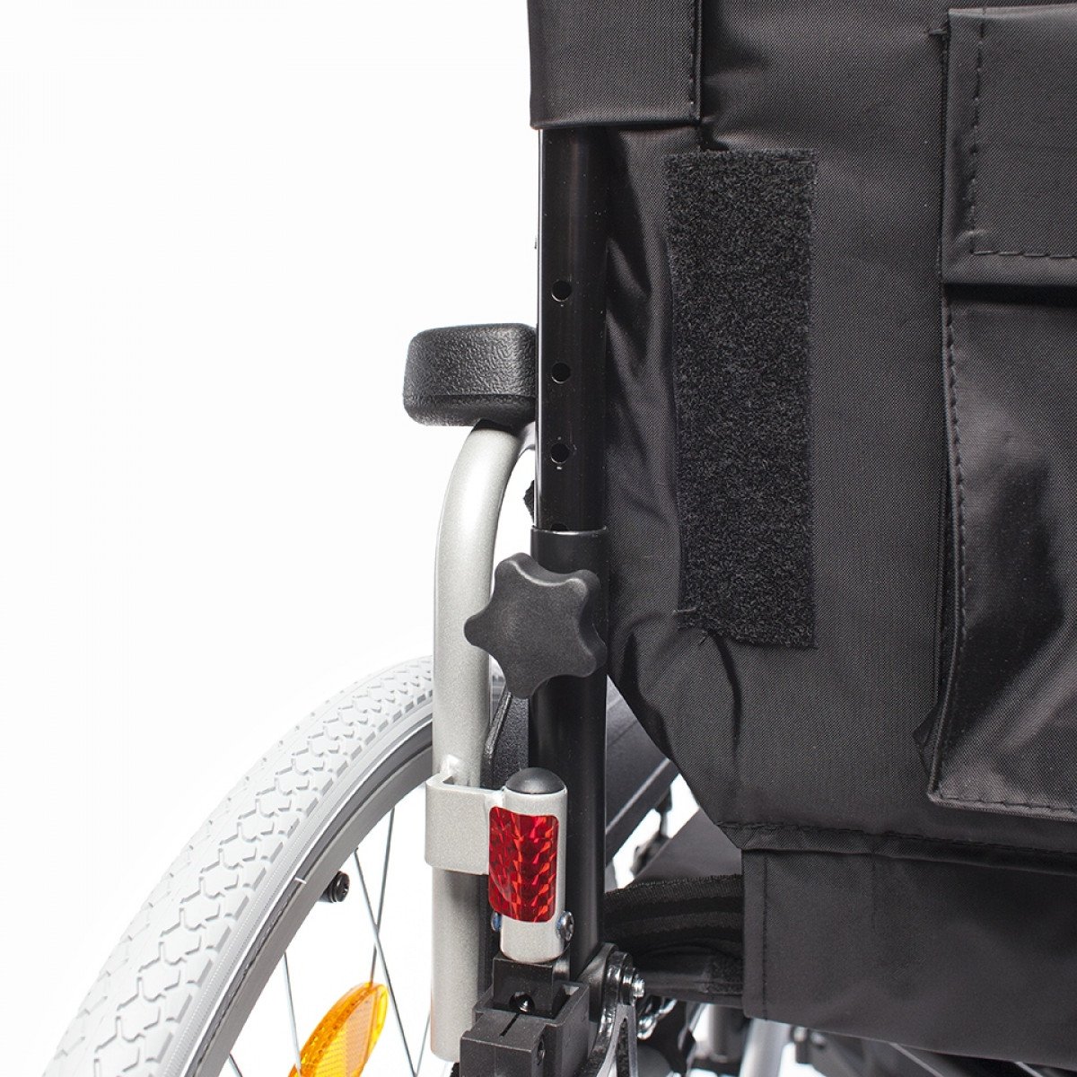 Коляска обеспечивает комфортную посадку за счёт регулировки сиденья по высоте и глубине, а также спинки по высоте. Подлокотники можно настроить по высоте, снять или откинуть для удобного пересаживания. Подножки регулируются, снимаются или откидываются, а раздельные опоры для стоп помогают правильно разместить ноги и снизить нагрузку при длительном сидении.