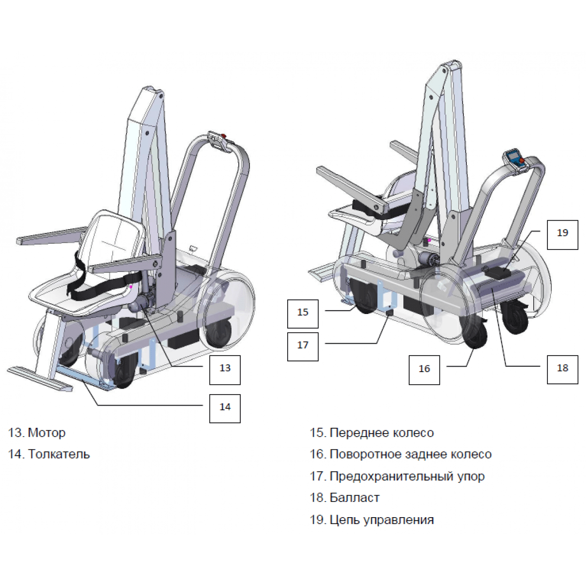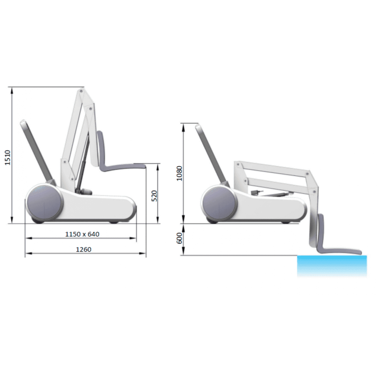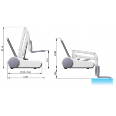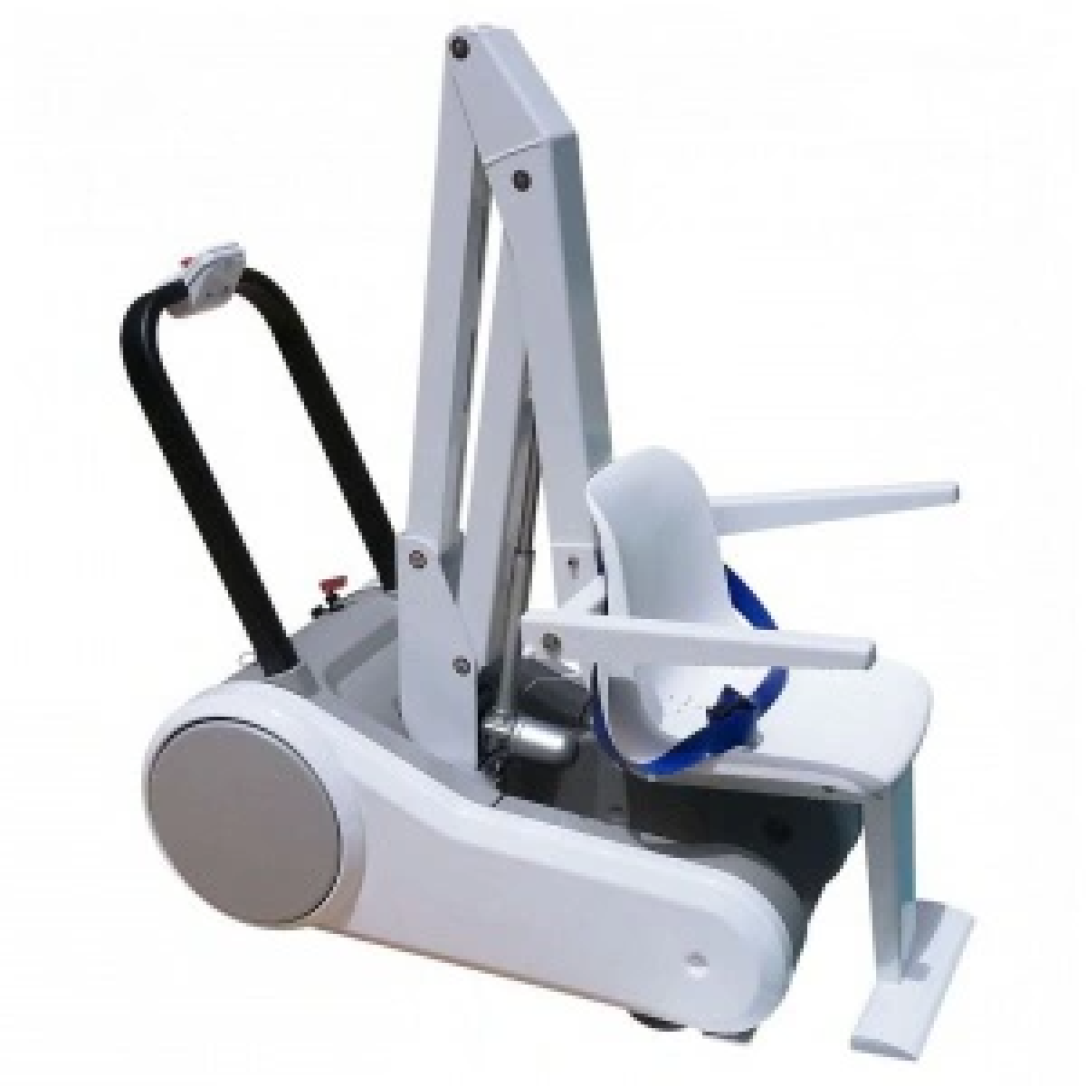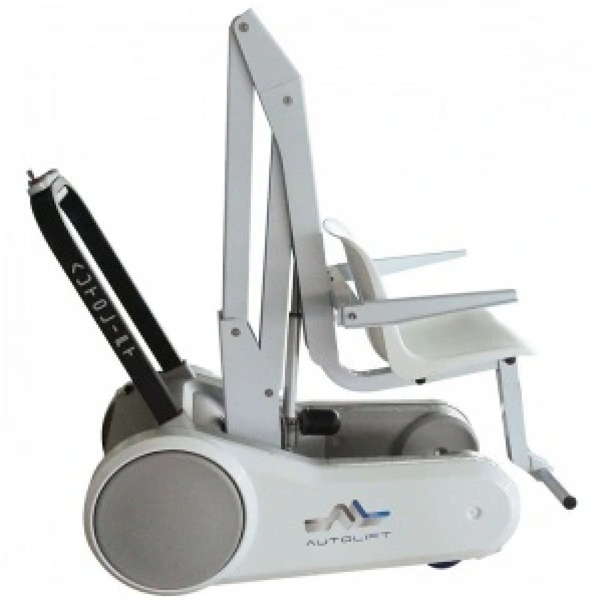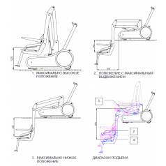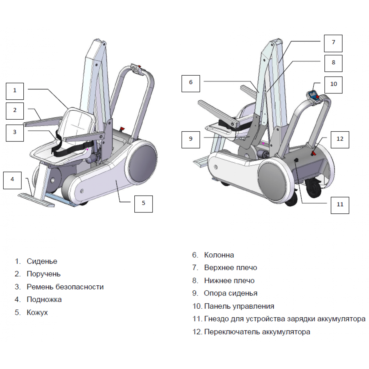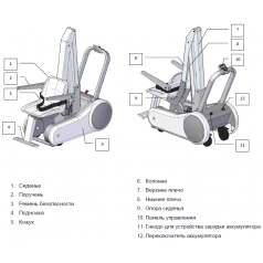 Подъёмник оснащён регулируемым сиденьем для комфортной посадки и панелью управления с кнопками подъёма, опускания и аварийной остановки. Перезаряжаемой батареи хватает примерно на 50 рабочих циклов, что обеспечивает автономность и удобство в повседневном использовании.