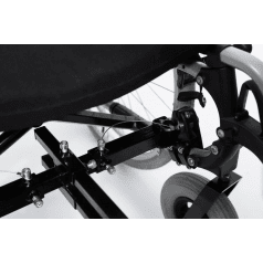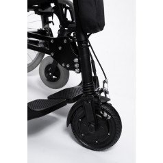 Задний ход в конструкции не предусмотрен: для движения назад достаточно удерживать руль одной рукой, а другой прокручивать обод колеса коляски. Управление интуитивное, руль складной и регулируется по высоте, что упрощает хранение и транспортировку.