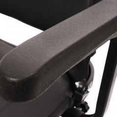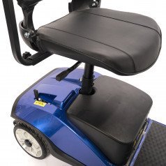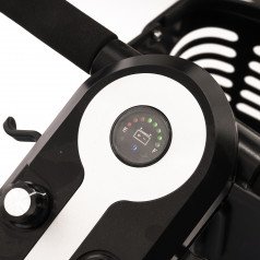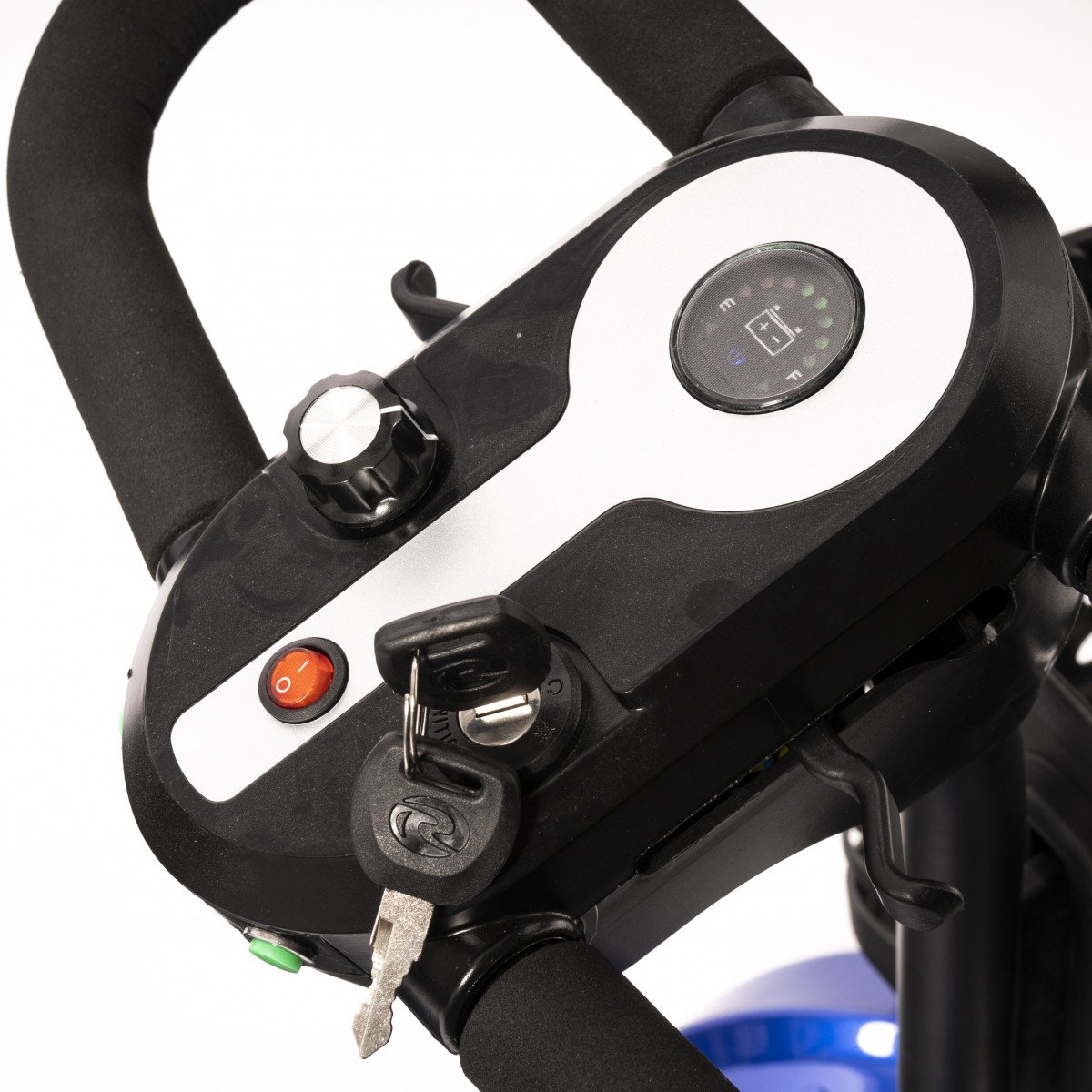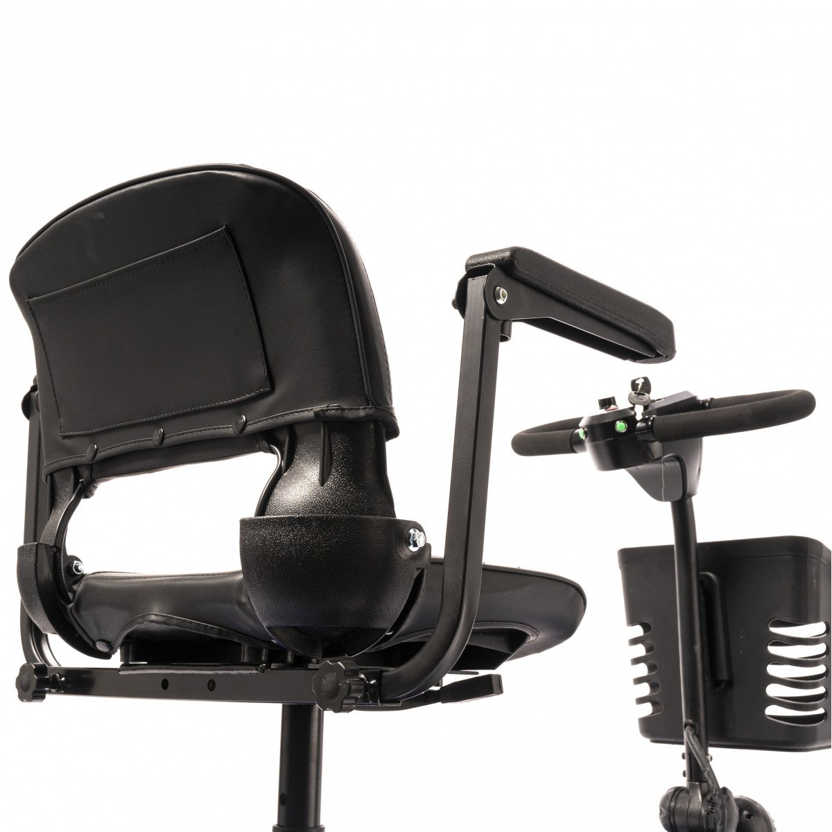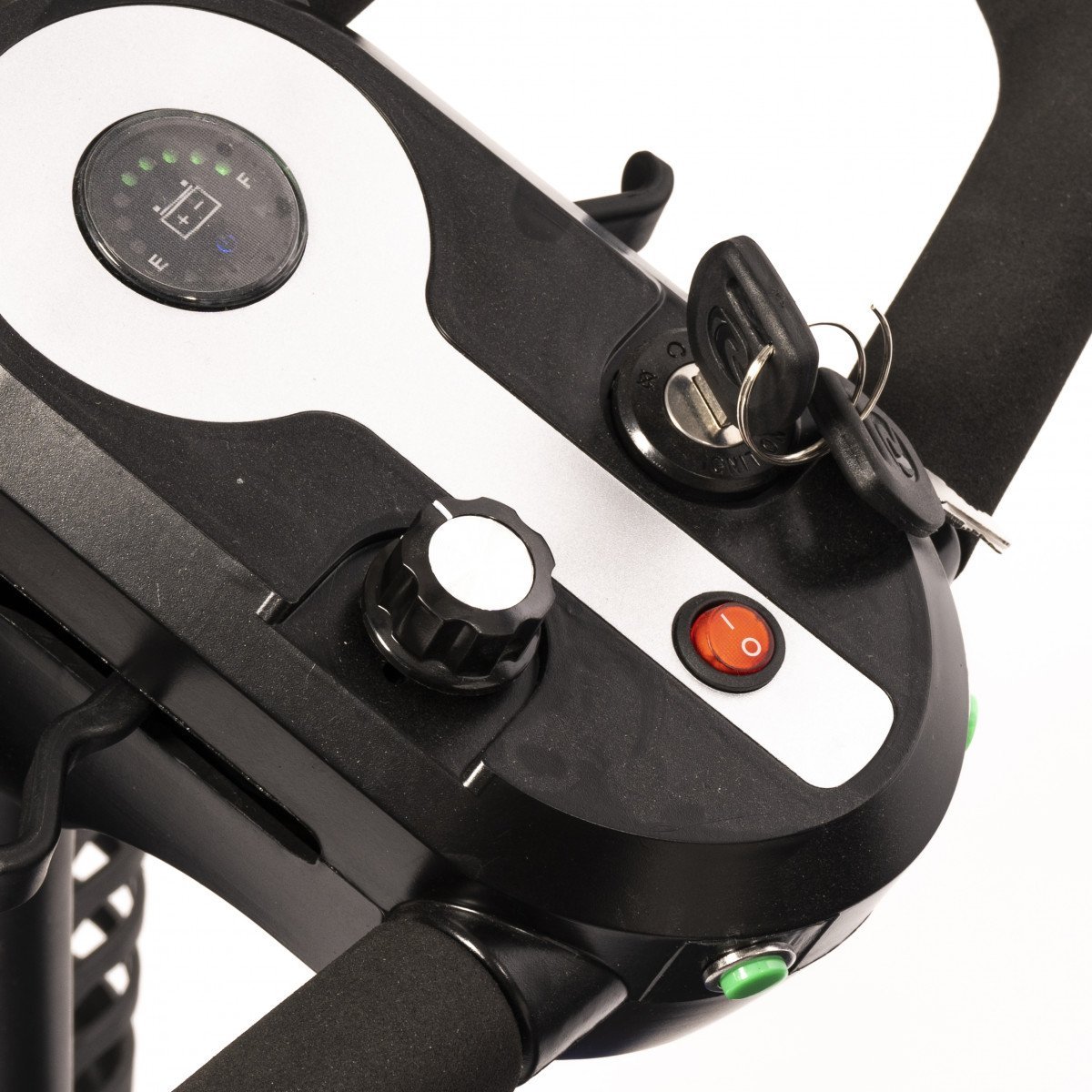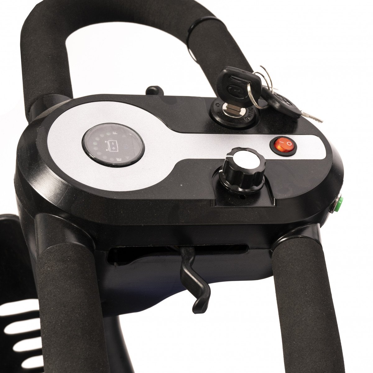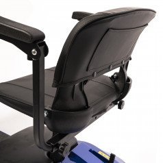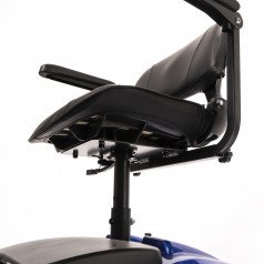 Он оснащён удобным рулём с панелью управления и поворотным сиденьем, которое включает откидывающиеся подлокотники, что значительно упрощает посадку на кресло даже для пользователей с проблемами опорно-двигательного аппарата. На передней панели руля расположены важные функции: переключатель «включить/выключить», индикатор заряда батареи, регулятор скорости, включатель передней фары, звуковой сигнал и акселераторы.