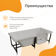 Ванна изготовлена из прочного сантехнического акрила, который долго сохраняет первоначальный белый цвет, устойчив к износу и обладает хорошими теплоизоляционными свойствами, поддерживая приятную температуру воды на протяжении всей процедуры. Дно ванны имеет нескользящее покрытие, а герметичная дверца с надёжным механизмом блокировки гарантирует полную защиту от протечек и случайного открывания.